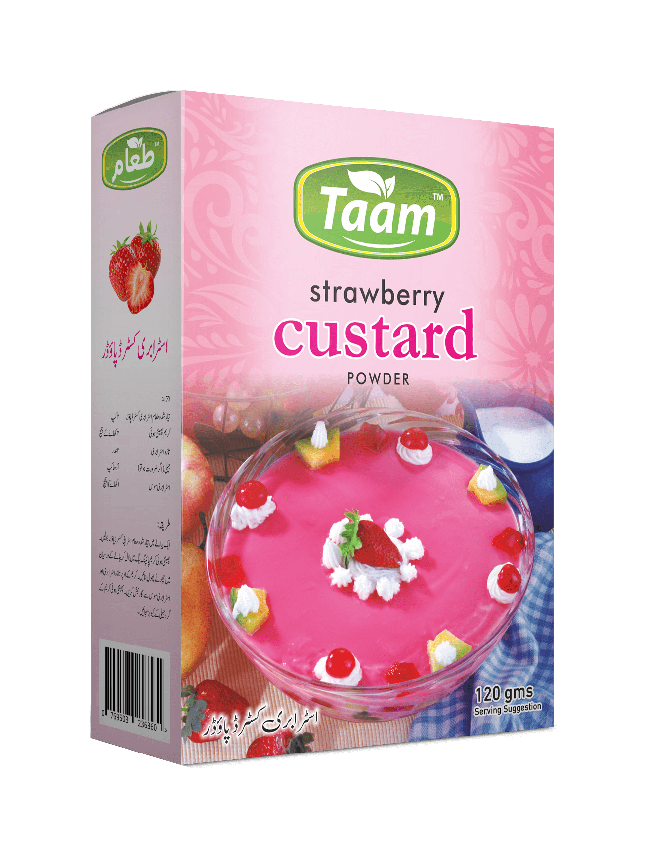 120gms Maize Starch (Contain sulphate), Salt, Artificial Strawberry Flover (Contain Soybeans and Products thereof), Contain Permitted Food Colors (FOOD RED 7) Per 100g Cooked Custard %GDA** Per 100g Energy (kcal) 110 6% Protein(g) 3 Carbohydrate(g) 19 Sugars (g) 14 15% Dietary Fiber (g) 0 Fat (g) 3 4% Saturated Fat (g) 2 10% Sodium (mg) 40 2% PACKAGING