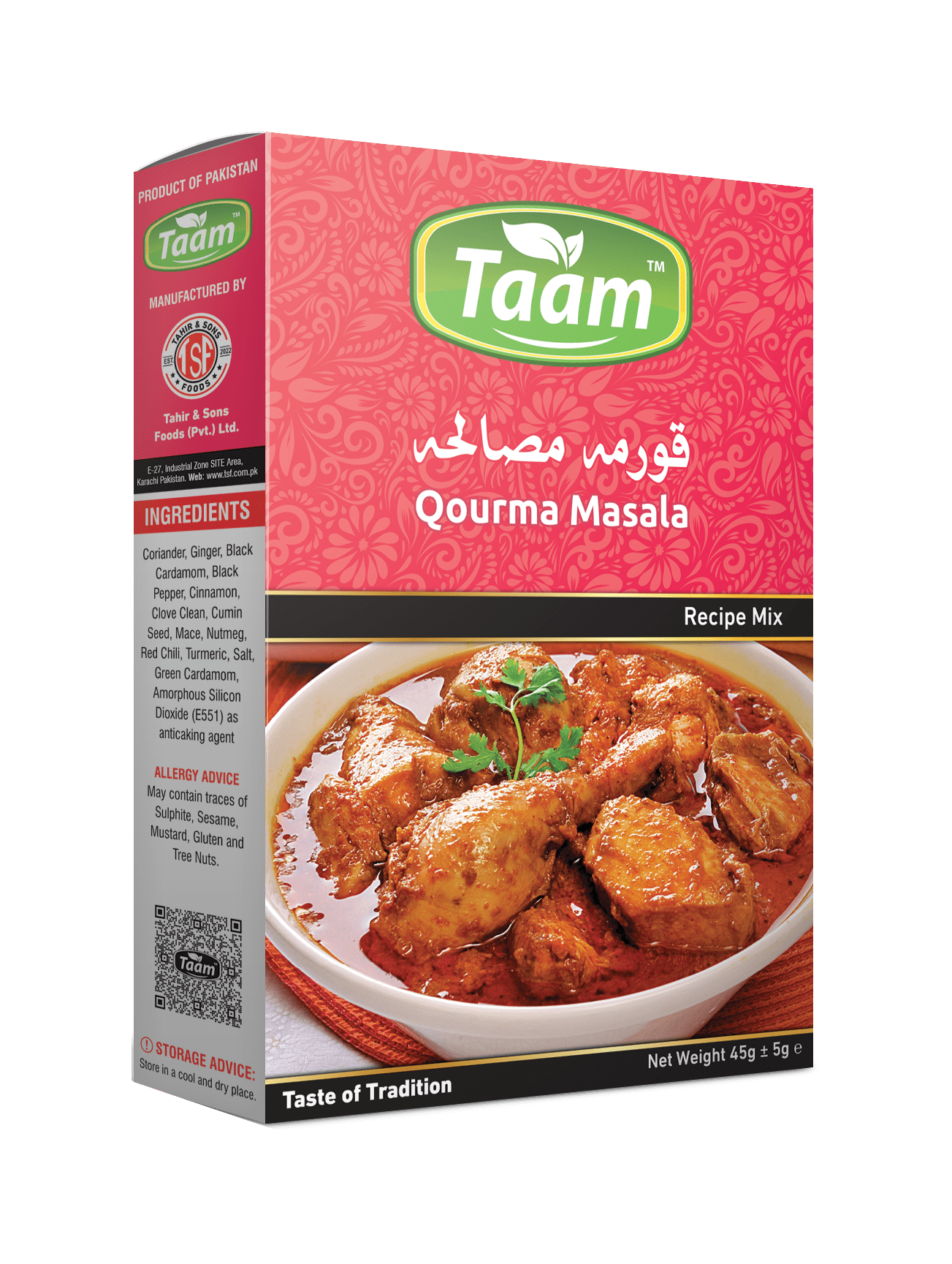 Coriander, Ginger, Black Cardamom, Black Pepper, Cinnamon, Clove Clean, Cumin Seed, Mace, Nutmeg, Red Chili, Turmeric, Salt, Green Cardamom, Amorphous Silicon Dioxide (E551) as anticaking agent